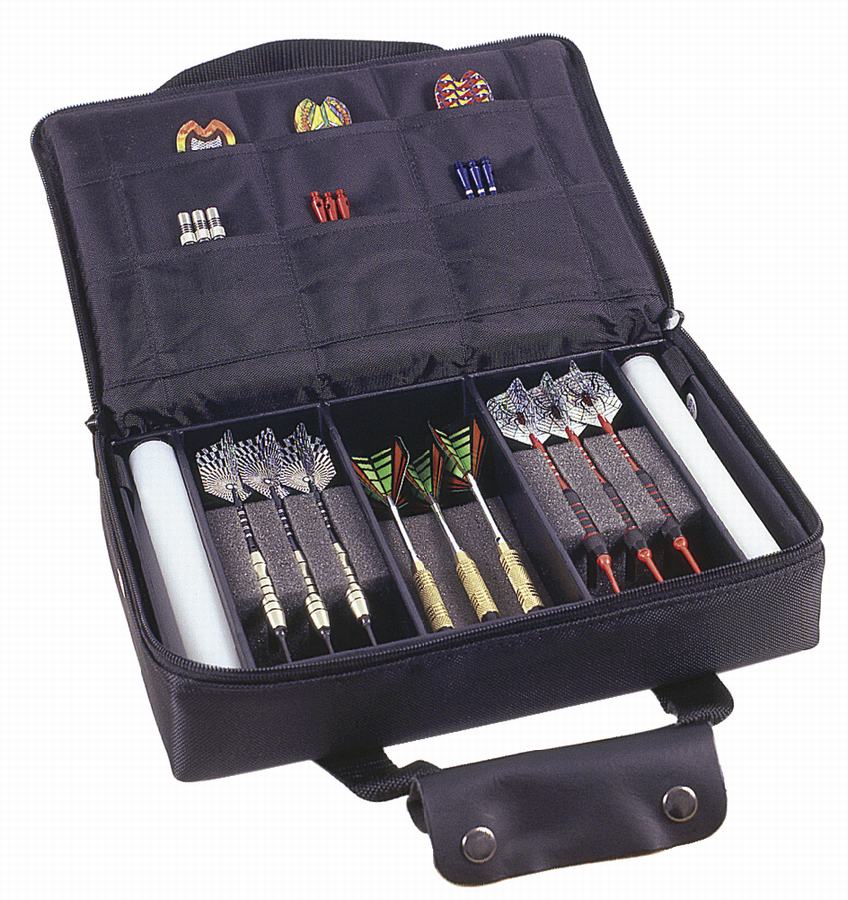 Die übersichtliche Profi-Luxustasche besticht durch ihre 5-fache Unterteilung. Platz für bis zudrei Sets montierter Darts und vielen Fächern für jede Menge Zubehör. Ersatzspitzen sind bestens in zwei Dartröhrchen untergebracht. Und die reißfesten Trageriemen mit Ledergriffen sind auch härtesten Einsätzen gewachsen.