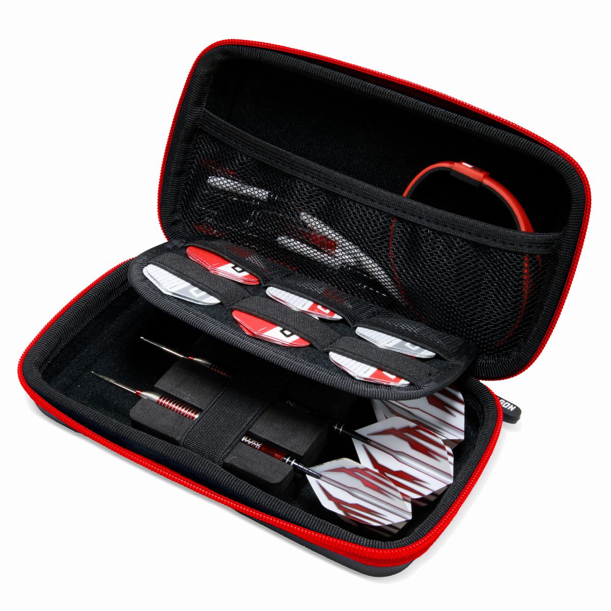 Inspiriert für das moderne Spiel mit modernstem Design. Hält 1 Satz komplett montierter Darts plus Zubehör. Hochwertiger Dartkoffer mit hervorragender Verarbeitungsqualität.