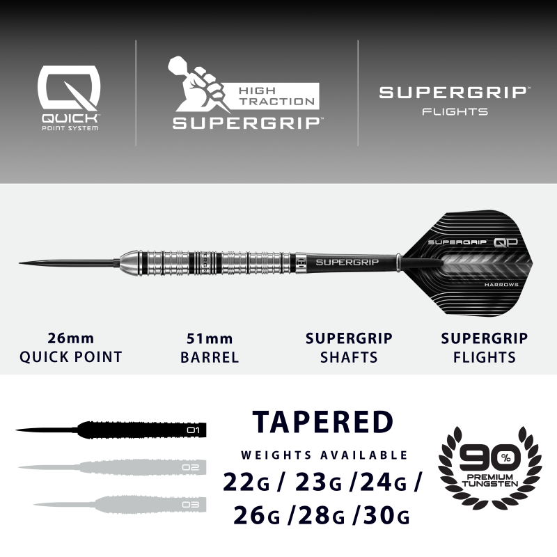 Mit der Quick Point-Technologie von Harrows können Spieler Spitzenlänge und -stil in Sekundenschnelle anpassen und so ihr Setup individuell optimieren. Das natürliche Wolfram-Finish wird durch elegante, mattschwarze Ringe und das ikonische Supergrip-Branding ergänzt und sorgt für einen ebenso edlen wie funktionalen Look am Oche.
